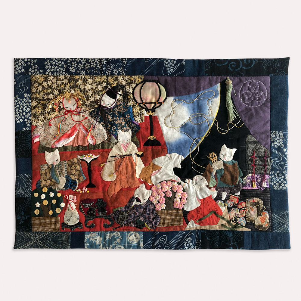 小見山信枝の作品は古布のはぎれを物語を綴るように縫いつなぎ、懐かしい情景、愛しいものたちの世界を描いています。